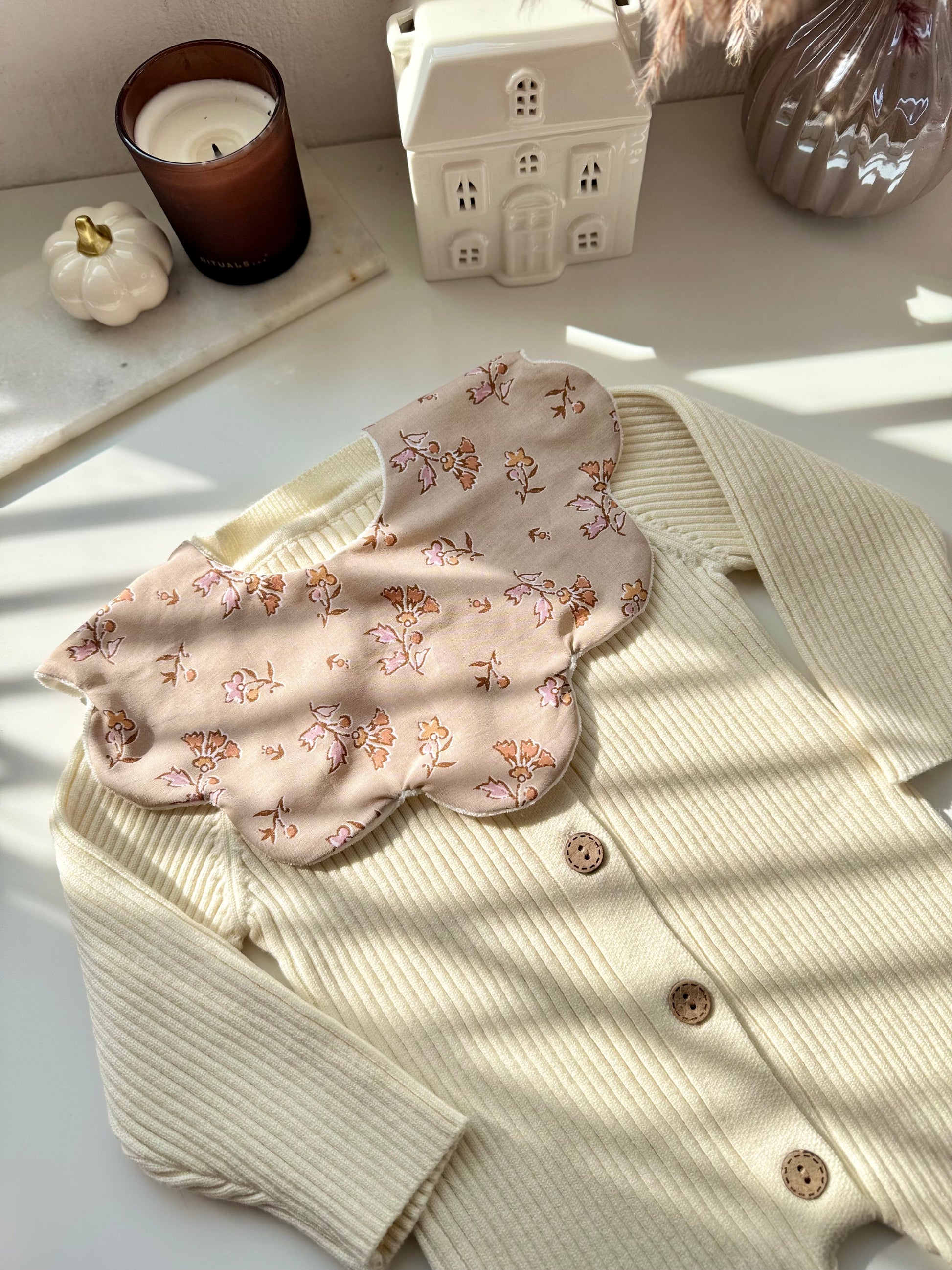 De voorkant is gemaakt van echte katoenen stof – tijdloos, zacht en comfortabel. De achterkant bestaat uit badstof, dat extra goed absorbeert en je baby droog en schoon houdt.