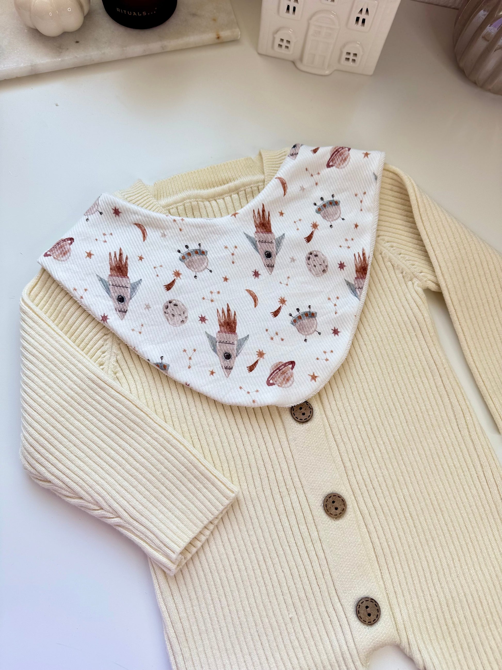 De voorkant is gemaakt van echte katoenen stof – tijdloos, zacht en comfortabel. De achterkant bestaat uit badstof, dat extra goed absorbeert en je baby droog en schoon houdt.