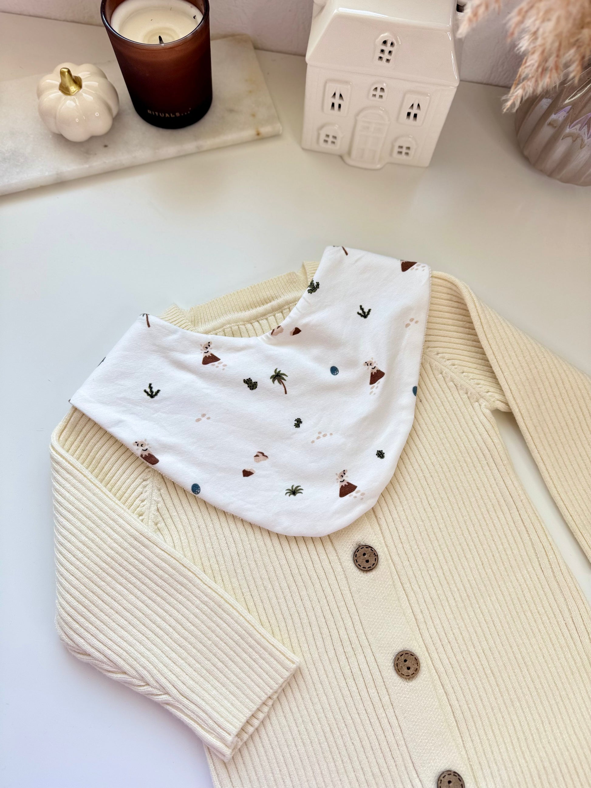 De voorkant is gemaakt van echte katoenen stof – tijdloos, zacht en comfortabel. De achterkant bestaat uit badstof, dat extra goed absorbeert en je baby droog en schoon houdt.